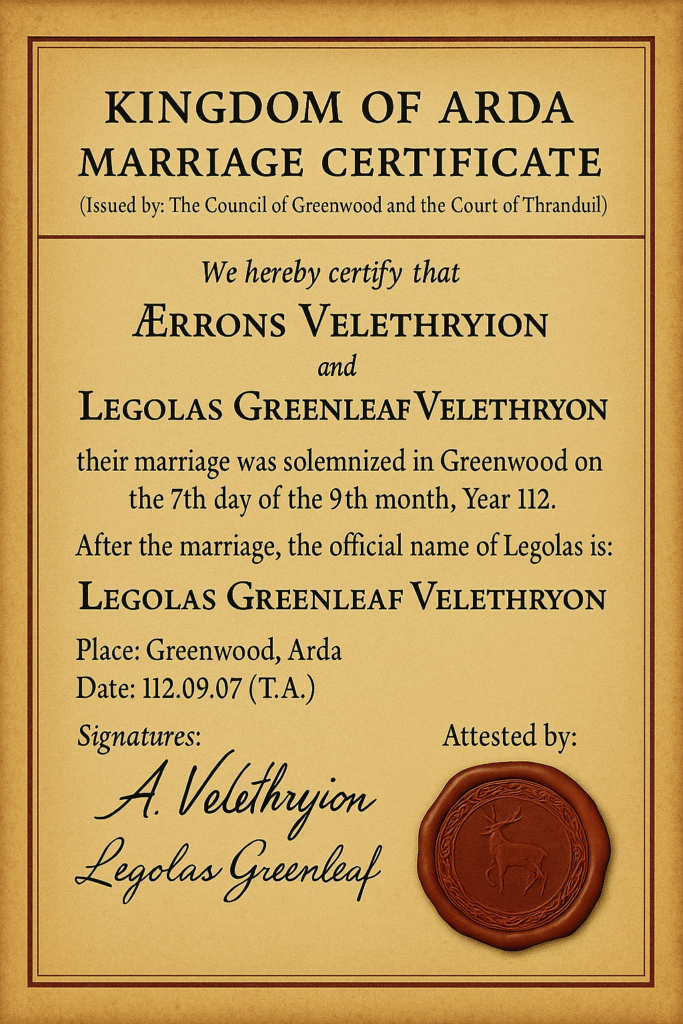 - 1. Image – Legolas and Ærr’s marriage certificate